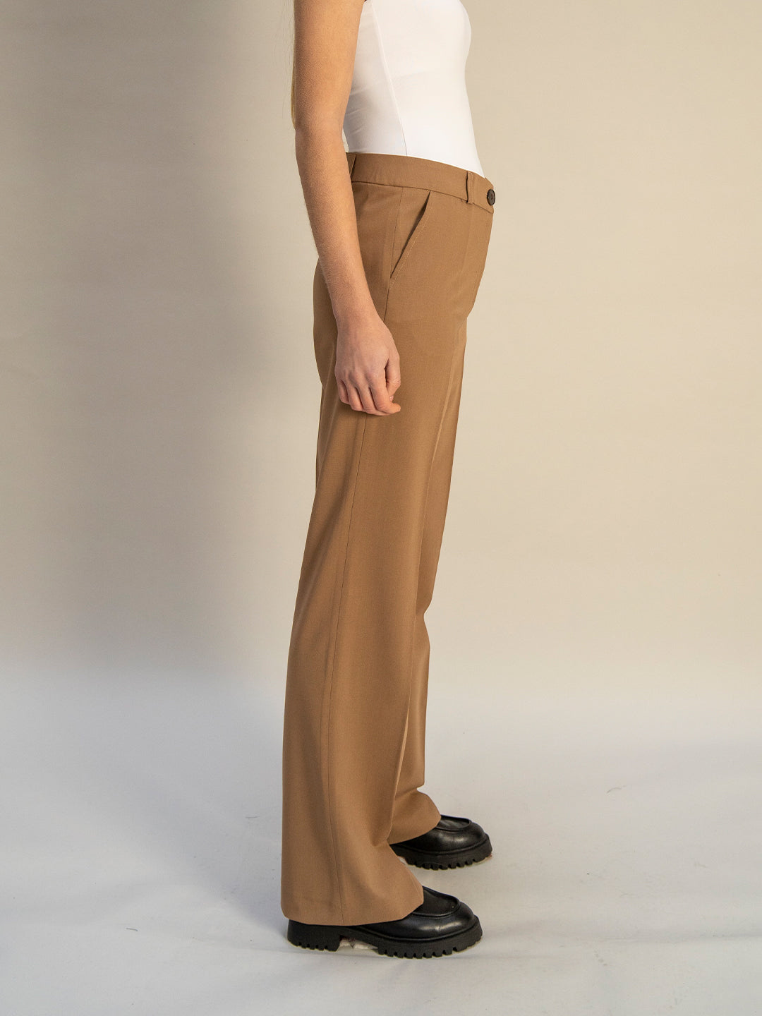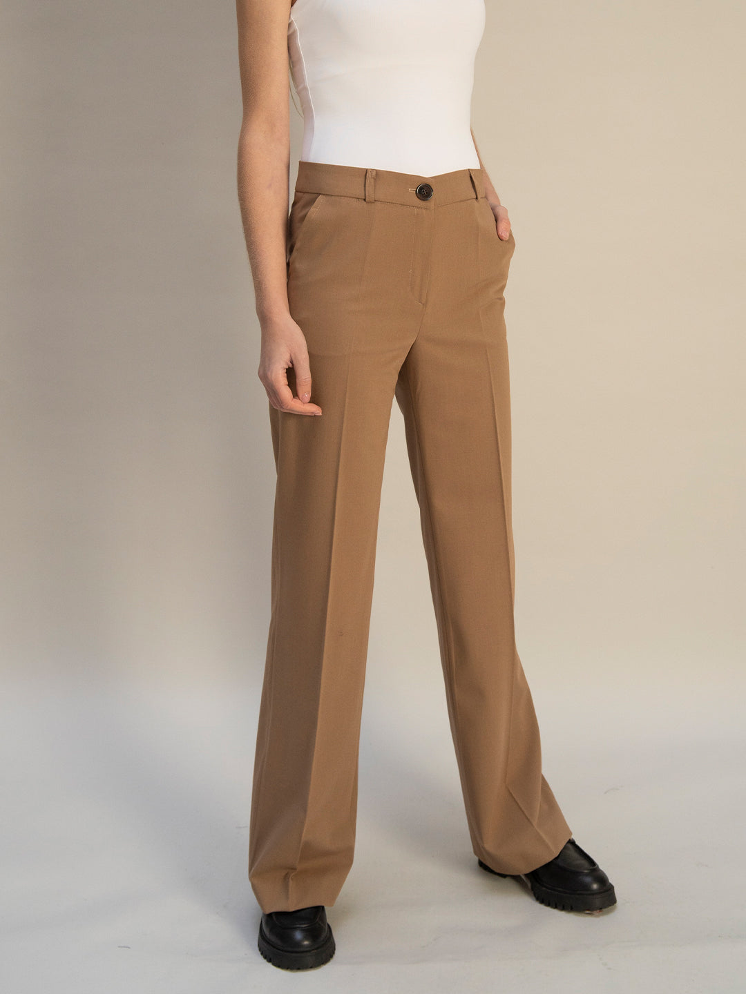 Le pantalon de tailleur droit Camel offre une allure chic et élégante, avec une largeur en bas de 28cm confère une coupe droite et moderne à la fois.