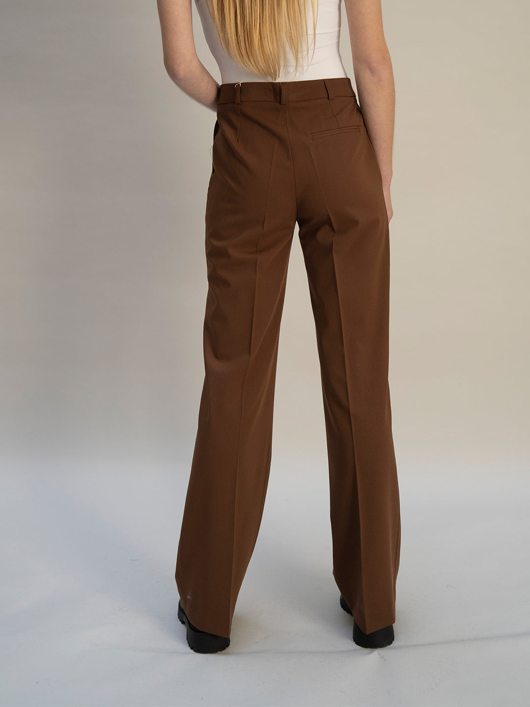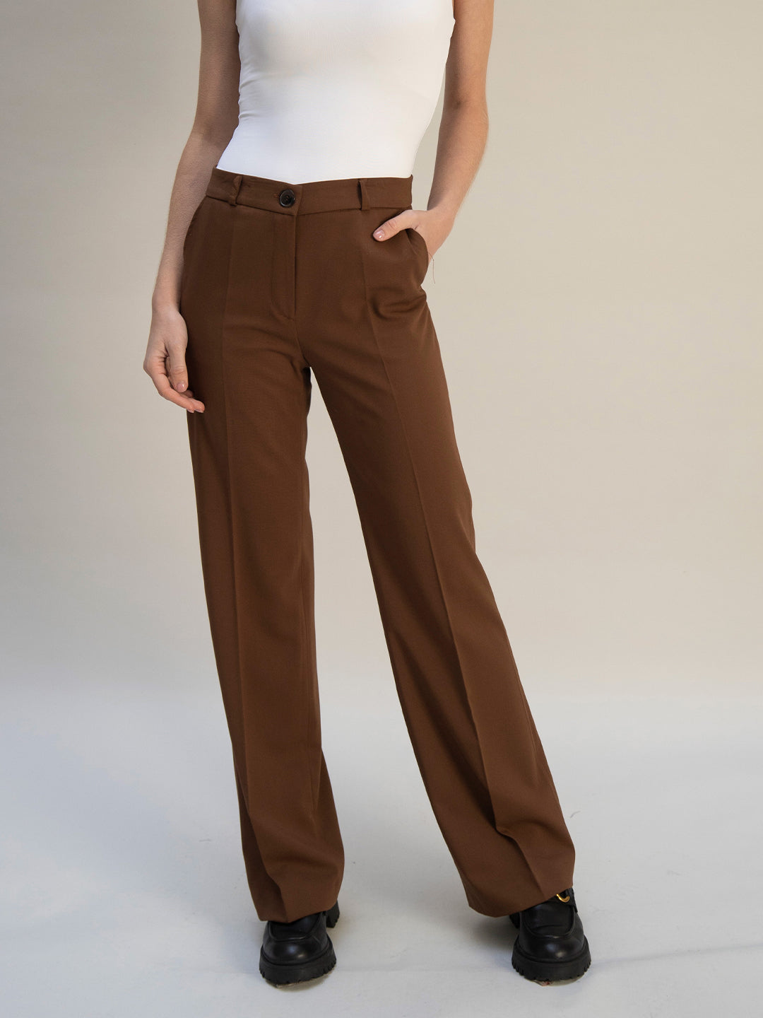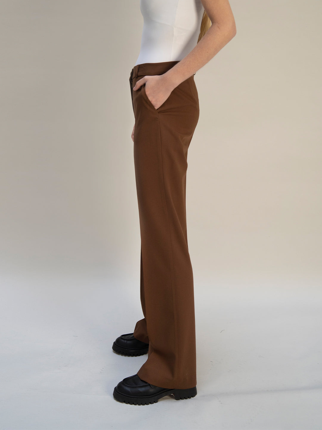 Le pantalon de tailleur droit Chocolat offre une allure chic et élégante, avec une largeur en bas de 28cm confère une coupe droite et moderne à la fois.