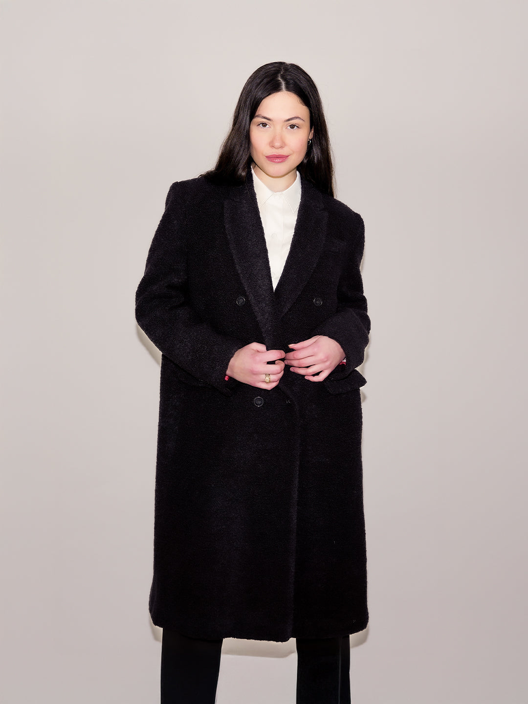 Le Manteau Sandy est une pièce élégante et intemporelle, confectionnée en 100% bouclette de laine pour une chaleur et un confort incomparables. Son col pointu et son double boutonnage croisé avec boutons jaspés lui confèrent une allure sophistiquée et moderne.
